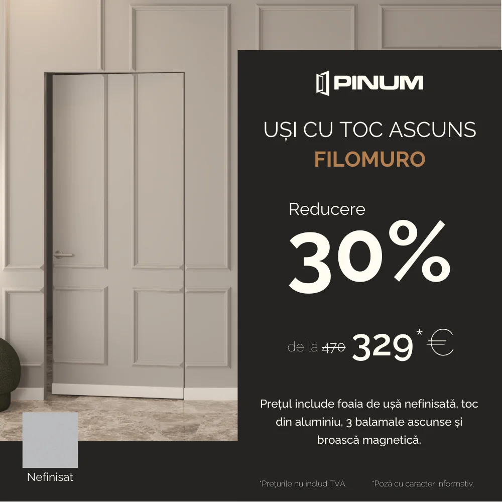 Uși interiorDiscounturi de până la 30% la cele mai iubite colecții de uși interior: Filomuro, Filomuro Plus, Sara, Sublime, Smart, Revers, Lăcuite Italia.